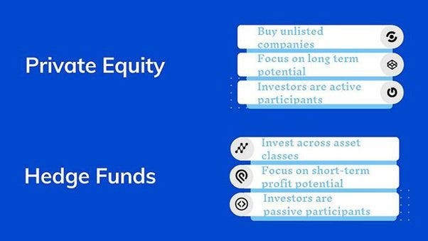 The primary difference between hedge funds and private equity is the type of investment they make. Hedge funds invest in publicly traded securities and use a variety of strategies to generate returns, while private equity invests in private companies or public companies that are taken private and focuses on improving their operations and profitability.